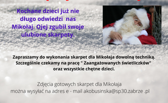Kochani, konkurs plastyczny Mikołaj zgubił skarpetki Nie możemy pozwolić, aby Mikołajowi zmarzły stopy